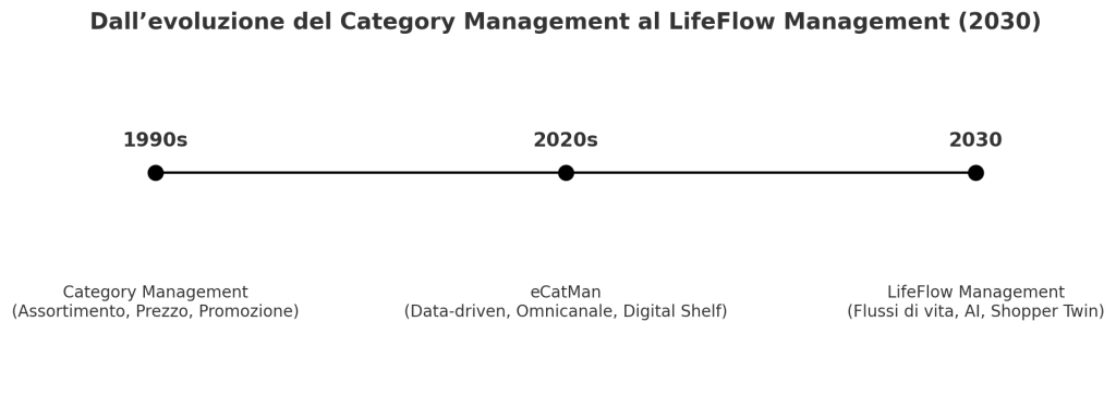 Se gli anni ’90 hanno visto nascere il Category Management e il 2020 l’esplosione dell’eCatMan, il prossimo decennio sarà quello del LifeFlow Management. Un sistema che non si limita più a gestire prodotti, ma interpreta e anticipa i bisogni del consumatore, orchestrando dati, AI e touchpoint in un’unica sinfonia di crescita.